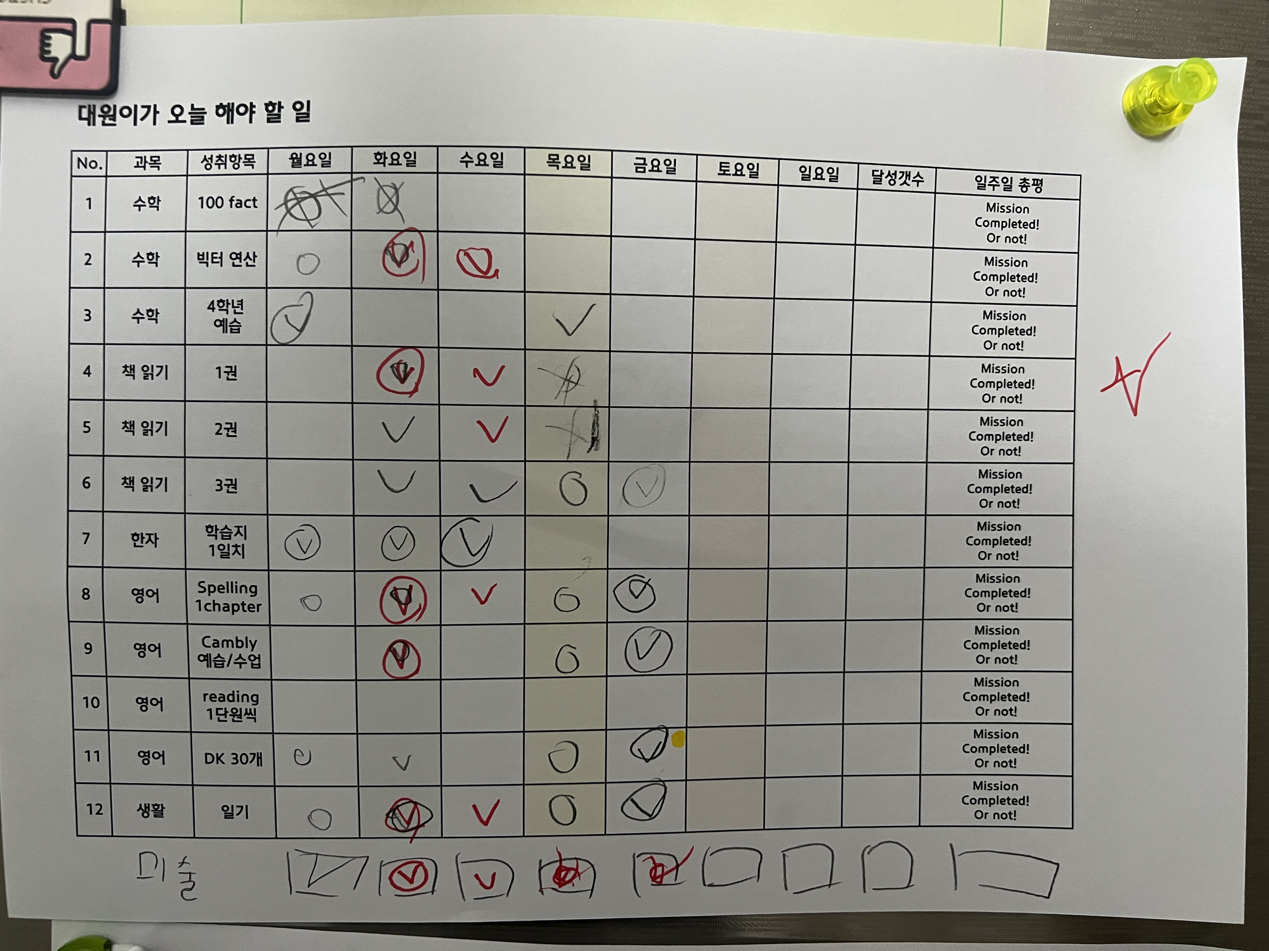 아이들이 스스로 오늘은 어떤 걸 하겠다고 "체크" 표시로 계획을 세우고