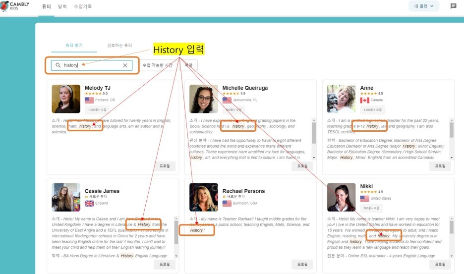 역사에 관련 된 튜터분들 중에서 각 선생님분들의 이력과 소개영상을 통해 좀 더 성향이 맞는 분을 선택할 수 있는 기능이 있어 좋습니다.!