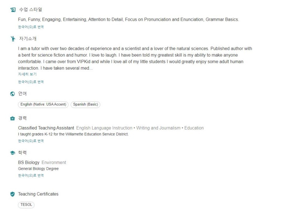 수업스타일/자기소개글/언어/경력/학력/자격증까지 정말 학부모가 알고 싶어 하는 내용들로 가득 있습니다. 자세히 읽어 보시면 어떤 분이신지 상세하게 아실 수 있습니다.